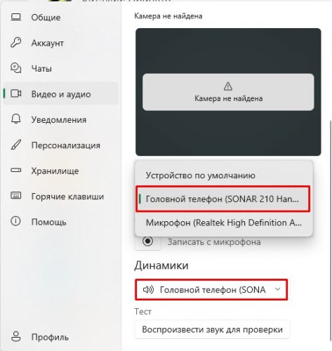 Если в каком-либо приложении для связи требуется выбрать нужные устройства (динамики и микрофон) – необходимо выбрать в обоих случаях «Головной телефон (SONAR 210 Hands Free-AG Audio)».