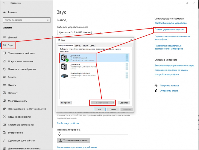 "Пуск - Параметры - Система - Звук - Панель управления звуком". На вкладке "Воспроизведение" нужно выбрать необходимое устройство, например, "3- 210 USB Headset" и установить его устройством "по умолчанию":